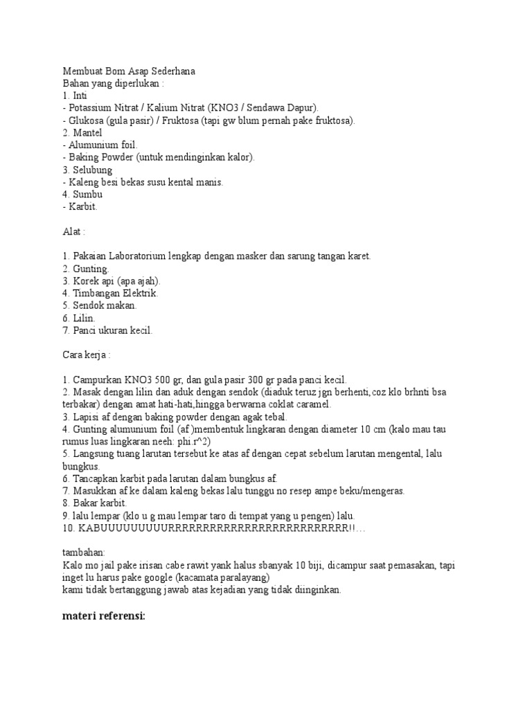 Bom asap yang Anda beli dari toko kembang api biasanya terbuat dari kalium klorat KClO3 - oksidator gula sukrosa atau dekstrin - bahan bakar natrium bikarbonat atau dikenal sebagai soda kue - untuk memoderasi laju reaksi dan menyimpannya. Bom kotak korek api type ini bakal meledakkan serta. Gunakan korek api untuk menyalakan sumbu bom asap.