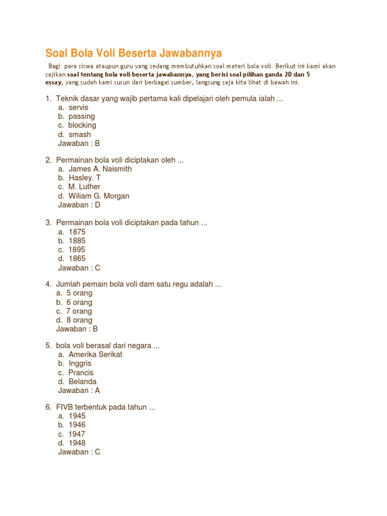 Soal Penjas Materi Bola Voli Pilihan Ganda beserta Jawabannya. Soal Essay Bola Voli Beserta Jawabannya Nov 05 2020 Soal Bola Voli Dan Jawabannya - Guru Ilmu Sosial buat 10 soal essay dan jawaban tentang materi penjas bola besar. 40 soal penjaskes bab permainan bola besar jawaban pilgan muttaqin id.