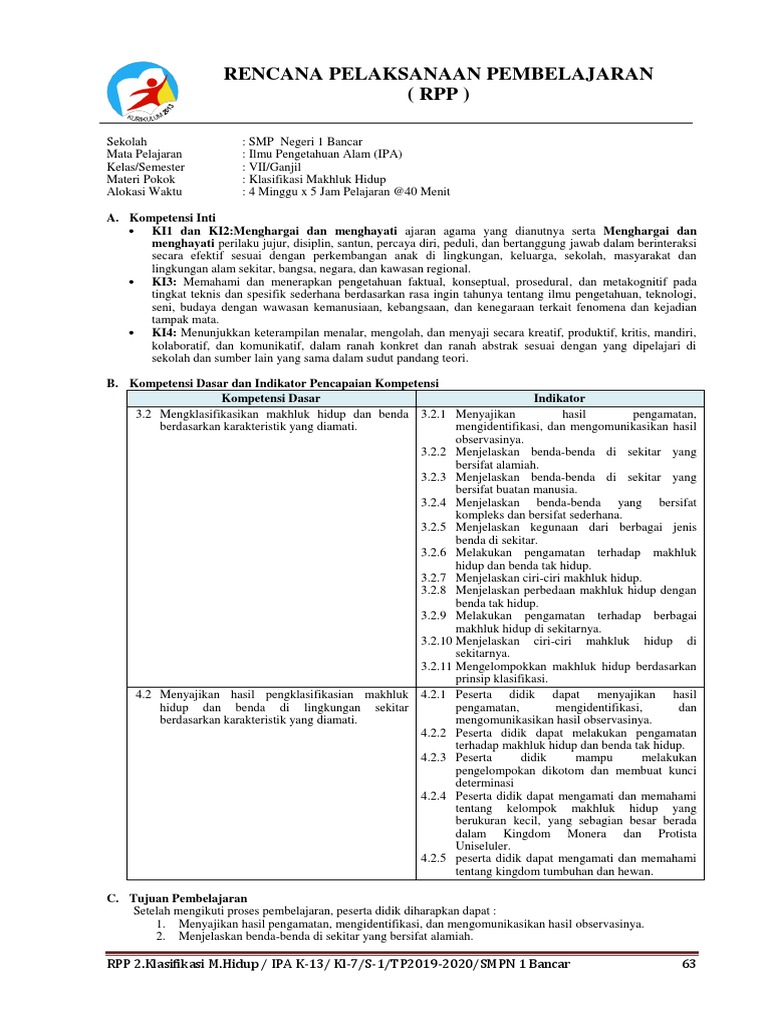 Rpp 2 Ipa K13 Kelas 7 Semester 1 Bab 2 Klasifikasi Makhluk Hidup