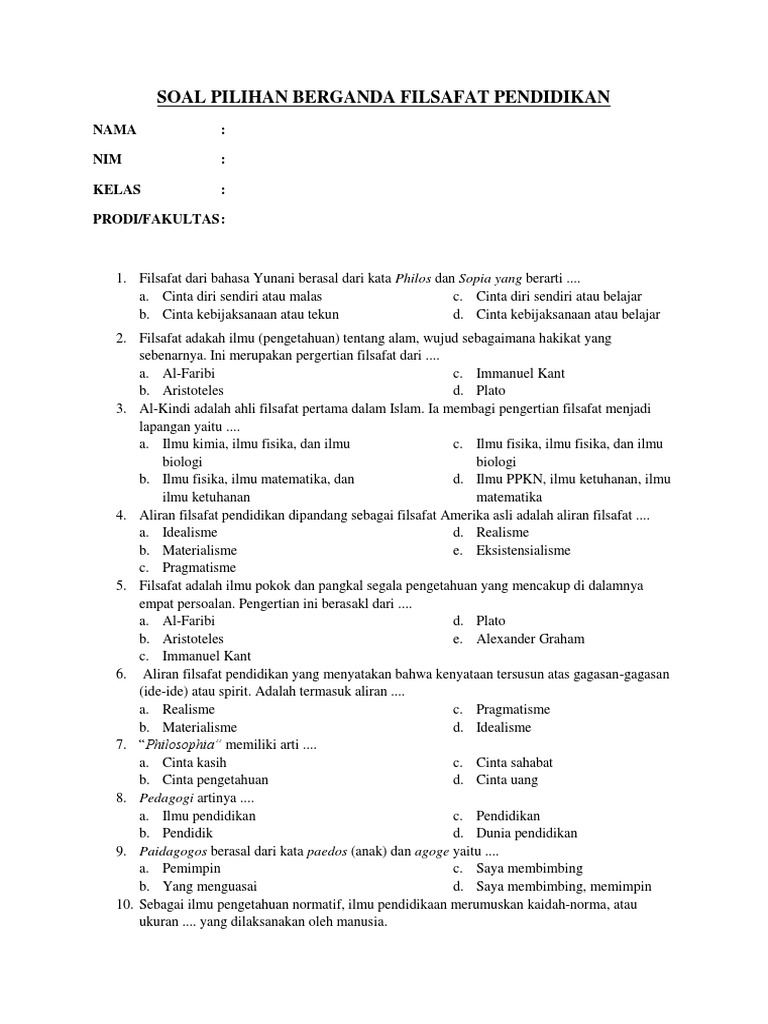 Soal Pilihan Berganda Filsafat Pendidikan